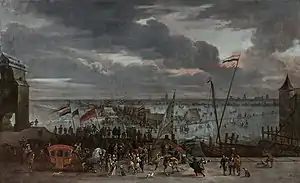 His main specialty was the composition of animated townscapes, in particular of city squares. His composition The Ommegang in Antwerp is an example of such a work. It was reinterpreted by various Flemish artists including Alexander van Bredael.[10] It may itself have been inspired by Pieter van Aelst's painting with the same theme.[11] Another lively city scene of Antwerp is the Figures in front of the frozen Scheldt in Antwerp painted in 1670 (Artcurial sale of 13 November 2018 lot 43). It shows a winter landscape of the river Scheldt, seen from the Anwerp quays. The Scheld is frozen solid and several tents and pavilions selling all kinds of food have been constructed on the ice. Several inhabitants of Antwerp are seen playing on the icy river, enjoying banquets and engaging in other amusements during the winter of 1670. The artist depicts various amusing scenes such as a woman on the verge of falling out of a sleigh pulled by a horse, a man defecating on the ice who is being chased way and a couple of men engaged in a brawl. Fellow Antwerp artist Sebastiaen Vrancx (1573-1647) painted half a century earlier the Ice pleasure on the Scheldt in Antwerp (Rijksmuseum, Amsterdam) showing a similar view of Antwerp's citizens having fun on the Scheldt.[12]