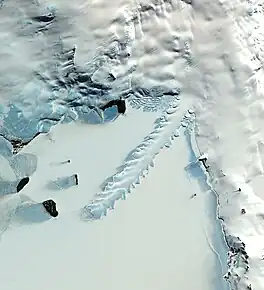 A large calving event took place on 1 March 1990, when a substantial portion of the Erebus glacier tongue was detached from the main glacier.[2] The piece that was separated was 3.5 km long and its mass was estimated to be 1011 kg.[3]