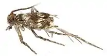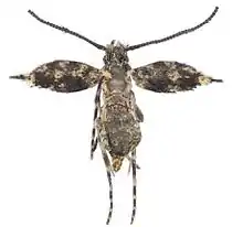 The length of the forewings is 1.4โ1.8 mm. This wing reduction occurs in both sexes. It is one of the few species of Lepidoptera known where this extreme of brachyptery involving both sexes has evolved. The forewings are dark fuscous with an irregular scattering of dull white scales at the base of the wing and mostly crossing the wing beyond the middle. There is a slightly larger concentration of dull white scales at the apex and extending a short distance along the costa. The hindwings are minute, slightly variable in size and without scales.