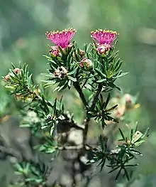 The flowers are pink to deep pink and occur in small groups (usually pairs) on the end of short branches from longer ones formed the previous year. The outer surface of the flower cup (the hypanthium) is densely hairy. There are 5 petals 3.5–4.6 millimetres (0.1–0.2 in) long. The stamens, which give the flower its colour, are arranged in 5 bundles, each containing 19 to 26 stamens. Flowering occurs from October to November and is followed by fruits which are woody capsules. The capsules are more or less urn-shaped, 5.8–7 millimetres (0.23–0.28 in) long with a rough, flaky surface.[2]