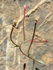 Eremothera chamaenerioides is a species of evening primrose known by the common name long-capsule suncup. It is native to the southwestern United States and northern Mexico, where it grows especially in desert regions. It is an annual herb producing an erect, hairy, glandular stem which is reddish in color and up to half a meter tall. The leaves are lance-shaped or oval and up to 7 or 8 centimeters long. The nodding inflorescence produces several flowers, each with white petals a few millimeters long and drying to dull red. The fruit is a capsule 3 to 5 centimeters long.
