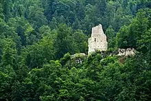 During the 11th century, the Lords of Erguel, or Arguel, moved from Franche-Comté and settled in the village of Sonvilier.[2] Exactly when they built Erguel Castle on a hill south-east of the village is unknown, but in 1178 and 1184 Heinrich von Erguël was mentioned ruling over the region.[1] The knights of Erguel owned land in the surrounding valley and held the vogt office over the church at Saint-Imier. The family kept the castle, the surrounding land and the lordship until 1264 when Otto von Erguel, who at the time lived in Basel, ceded them to the Prince-Bishop of Basel. In return the bishop granted him lands in Alsace.