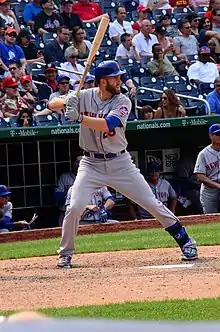 Campbell was promoted to the Mets from Las Vegas on May 10, 2014, in what his father Hugh described as a "glorious weekend".[4][13] He made his debut batting against the Philadelphia Phillies in the bottom of the sixth inning pinch-hitting for Lucas Duda with the bases loaded, hitting a sac-fly to right fielder Marlon Byrd on a 1–0 count driving in Daniel Murphy for his first major league RBI off pitcher Jake Diekman.[14] On May 11, Campbell got his first major league hit, a single in the bottom of the fourth inning off pitcher Cole Hamels.[15] On May 21, he hit his first major league homerun, a two-run home run off Los Angeles Dodgers' pitcher Hyun-jin Ryu.[16]