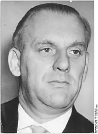 Grützner was then sent to Leipzig where between February 1954 and March 1959 he was chairman of the regional FDGB board.[2] In this position he was also, from July 1955 till October 1959, also a member of the national presidium of the FDGB.[3] He was also a member of the ruling SED (party)'s Leipzig regional leadership, a position he retained till 1989. In 1954 Grützner was "elected" to the Leipzig City Council on which he continued to sit till 1981.
