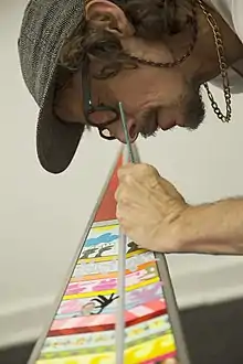 Erik Parker is known for his precisely brightly colored, layered and highly saturated canvases. Parker's work depicts unique, fantastical scenes of biomorphic subjects and landscapes. Parker methodically paints each composition creating an intense visual experience.[4] His work maintains a premeditated sense of order while at the same time his composition is composed of bold and fragmented forms.[5] Parker employs many styles in his work, from graffiti to psychedelic album covers and cartoons.[6] Drawing from elements of American subculture, Parker creates color infused paintings that illustrate his take on the pressing issues of our time.[7]
