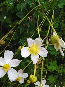 Eriocapitella vitifolia, a species of flowering plant in the buttercup family Ranunculaceae, is native to Asia.[1] The specific epithet vitifolia means "vine-leaved, with leaves resembling those of Vitis",[2] the genus of grapevines, and so the plant is commonly called the grape-leaved anemone or grape-leaved windflower. In Chinese, a common name is ye mian hua,[3] which means "wild cotton".[4]