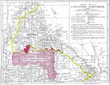 In March 1870, an Italian shipping company became a claimant to the territory at the northern end of Assab Bay, a deserted but spacious bay about half-way between Annesley Bay to the north and Obock to the south.[11] The area —which had long been dominated by the Ottoman Empire and Egypt was not settled by the Italians until 1880.[12] In 1884, the Hewett Treaty was signed between the British Empire and Ethiopia, reigned by Emperor Yohannes IV (r. 1871–1889). The British Empire promised the highlands of modern Eritrea—and free access to the Massawan coast to Ethiopia in exchange for its help evacuating garrisons from the Sudan, in the then-ongoing Mahdist War.[13] In 1889, the disorder that followed the death of Yohannes IV, Italian General Oreste Baratieri occupied the highlands along the Eritrean coast and Italy proclaimed the establishment of a new colony of "Eritrea", (from the Latin name for the Red Sea), with its capital at Asmara in substitution for Massawa.[14] On 2 May 1889, the peace and friendship Treaty of Wuchale was signed between Italy and Ethiopia, under which Italian Eritrea was officially recognised by Ethiopia as part of Italy.[15] However, Article 17 of the treaty was disputed, as the Italian version stated that Ethiopia was obliged to conduct all foreign affairs through Italian authorities (in effect making Ethiopia an Italian protectorate), while the Amharic version gave Ethiopia considerable autonomy, with the option of communicating with third powers through the Italians.[16][17][18] This resulted in the First Italo-Ethiopian War,[19] which the Ethiopians won, resulting in the Treaty of Addis Ababa in October 1896. Italy paid reparations of ten million Italian lira. Unusually, the Italians retained most, if not all, of the territories beyond the Mareb-Belessa and May/Muni rivers that they had taken, with Emperor Menelik II (r. 1889–1913) giving away part of Tigray.[20][21] On 2 August 1928, Ethiopia and Italy signed a new friendship treaty.[22]
