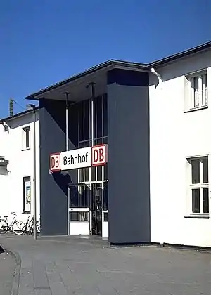 Erkelenz station on the Aachen–Mönchengladbach railway is in the town of Erkelenz in the German state of North Rhine-Westphalia. It has been classified by Deutsche Bahn since January 2011 as a category 4 station.[1] The station is served by the Wupper-Express and the Rhein-Niers-Bahn.