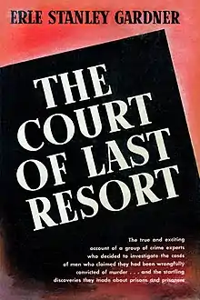 Gardner devoted thousands of hours to the Court of Last Resort, in collaboration with his many friends in the forensic, legal, and investigative communities. The project sought to review and, when appropriate, reverse miscarriages of justice against criminal defendants who had been convicted because of poor legal representation, abuse, misinterpretation of forensic evidence, or careless or malicious actions of police or prosecutors. The resulting 1952 book earned Gardner his only Edgar Award, in the Best Fact Crime category,[23] and was later made into a TV series, The Court of Last Resort.