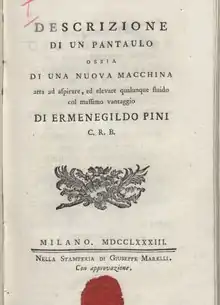 - Descrizione di un pantaulo ossia di una nuova macchina atta ad aspirare, ed elevare qualunque fluido col massimo vantaggio di Ermenegildo Pini C.R.B. Milano: nella Stamperia di Giuseppe Marelli. 1783.