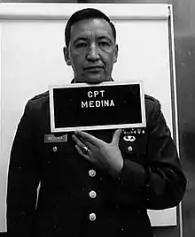 Ernest Medina was born on August 27, 1936, into a Mexican-American family in Springer, New Mexico. After a variety of post–high school odd jobs, Medina joined the Army in 1956.[1] He served 12 years in the enlisted ranks (including his time in the National Guard) before being commissioned through Officer Candidate School in 1964.[2] Awarded both the Silver Star and Bronze Star Medal, Medina was promoted to captain in 1966 and was given command of Charlie Company in Hawaii, prior to its deployment to Vietnam.[3]