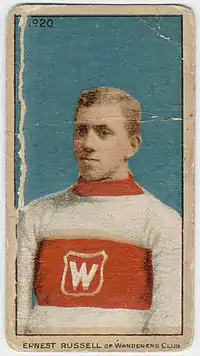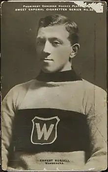 Ernest Russell (October 21, 1883 – February 23, 1963) was a Canadian professional ice hockey player. He was born in Montreal, Quebec, and played for the Montreal HC and Montreal Wanderers in the early 1900s. Russell was the offensive star of the Wanderers that won the Stanley Cup in 1906, 1907, 1908, and 1910. He once scored a hat-trick in five consecutive games. Russell was inducted into the Hockey Hall of Fame in 1965.[2]