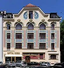 The earliest projects, presented as Helbig and Haiger's joint works, belonged to the reform movement against historicism. In 1898 his drafts for smaller country houses and Biedermeier style furniture were unusually simple and modest for those days.[5] Eccentric drafts followed in the style of Art-Nouveau with highly coloured façades, such as the well-known houses in Munich's Schwabing area (see below). Soon Haiger turned away from the Art Nouveau style, freely using elements of]the 18th and early 19th century architecture, which became characteristic for his later designs. In his drafts for large-scale buildings during the Nazi period – modified by Adolf Hitler's interventions – one finds elements of Troost's new Neoclassicism (fluted pillars, right-angled profiles).