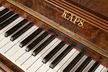 The piano brand Kaps or Ernst Kaps Pianofortefabrik was founded and produced in Dresden Germany in 1858 by Ernst Karl Wilhelm Kaps. Ernst Kaps was born in Döbeln on 6 December 1826 and died in 1887 in Dresden, Saxony.[2] Kaps was appointed in 1879 an honorary member of the Royal Swedish Academy of Music[3] His son Ernst Eugen, born in 1864, died in early 1910 in Dresden under suspicious circumstances. A report suggested he may have taken his own life as a result of his company facing receivership.[4] His second Son Wilhelm Karl, born in 1872, and died in 1943 in Tolkewitz. However, the "yearbook of wealth and income of the millionaires in the kingdom of Saxony" of 1912[5] states that two of the family members, Wilhelm and Gertrud Kaps, each had 1.3 M marks and an annual income of 0.11 M Marks. In 1876, the company exhibited at the Centennial International Exhibition in Philadelphia.[6] In 1922, the company, then known as Ernst Kaps Piano Fabrik AG, merged with another company, owned and founded by Johann Kuhse, whose piano manufacturing business was founded in Dresden in 1874.[7] In 1925 the factory, then known as the Kaps/Kuhse Pianoforte AG, made both piano brands alongside each other. The Dresden factory closed in 1930, and at this point the company had reported its final serial number as No. 37500. The Dresden factory produced 37,500 pianos and grand pianos and ever since 1885 manufactured a consistent 1,000 pianos per year. There were showrooms at 13 Altmarkt, Dresden and 18 Schloss -Strasse, Dresden with branches in Paris, London, Irkutsk Oblast and St Petersburg, Russia.