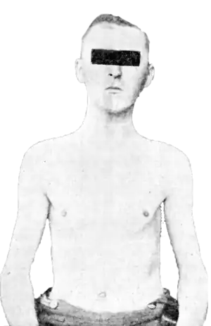 The characteristics of the well-developed cases include: rounded figure, middle height, a soft broad face on a short massive neck, sitting between the shoulders, shoulders are not broad; soft, rounded, and displaying little muscle relief limbs, the hands soft, rather wide and short.[4]