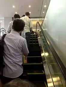 Escalator etiquette is the etiquette of using escalators. In many places, there is a convention that people should stand on a particular side to allow other people to walk on the other side.[2] Standing on the right is the most common convention, following early escalator design in London.[1] In the 21st century, there have been campaigns for standing on both sides for reasons of safety or to increase capacity.[3][1]