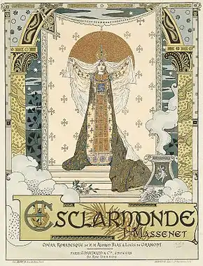 Esclarmonde (French pronunciation: [ɛsklaʁmɔ̃d]) is an opéra (French: opéra romanesque) in four acts and eight tableaux, with prologue and epilogue, by Jules Massenet, to a French libretto by Alfred Blau and Louis Ferdinand de Gramont. It was first performed at the Exposition Universelle on 15 May 1889 by the Opéra-Comique at the Théâtre Lyrique on the Place du Châtelet in Paris.