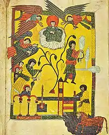 The Escorial Beatus (Escorial, Biblioteca Monasterio, Cod. & II. 5) is a 10th-century illuminated manuscript of the Commentary on the Apocalypse by Beatus of Liébana. The illuminations of the manuscript show similarities in style to those produced by Florentius, the artist responsible for a copy of the Moralia in Job of Pope Gregory I (Madrid, Biblioteca Nacional, Cod. 80). The manuscript was probably created at the monastery at San Millán de la Cogolla. There are 151 extant folios which measure 395mm by 225mm. The manuscript is illustrated with 52 surviving miniatures.