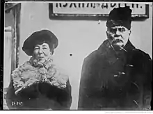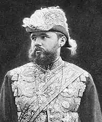 He also took note of the effects of Alexander III's policies of Russification. Historically, Russianiness as defined by the Russian state was not in terms of language or ethnicity, but rather in terms of loyalty to the House of Romanov with those loyal to the Romanov family being Russian. Thus, the Russian state had been very tolerant of Buddhism with the Empress Elizabeth extending state support for the Buddhist clergy of the Kalmyks and the Buryats in 1741 in exchange for their loyalty.[4] During the reign of the Emperor Alexander III Russianness started to be redefined in terms of the Russian language and culture together with the Orthodox faith, which stained the loyalty of previously loyal peoples such as the Kalmyks and the Buryats.[4] Ukhtomsky would later write reports criticising the overzealousness of the local Orthodox clergy in attempting to win converts, and expressed tolerant views regarding Russia's non-Orthodox faiths. Ukhtomsky had mystical notions about Buddhism, which he combined with his belief in the myth of the "White Tsar", which led him to the original definition of Russianness that saw those as loyal to the Russian state as Russian, regardless of what their language or religion was.[4] In one of his reports, Ukhtomsky argued that Buddhist peoples such as the Buryats and the Kalmyks "instinctively" had "an inner link with the people of far-away North".[4] Ukhtomsky criticised the policy of Russification and argued for the loyalty of the Buddhist clergy towards the Russian empire, blaming all of the difficulties in Buddhist-Orthodox relations on the Orthodox Archbishop of Irkutsk, Veniamin.[3] Ukhtomsky had a very strong state-centric version of Russian nationalism that saw the loyalty to the monarchy as the epitome of Russianness, and his vision of a tolerant Russian empire was intended to strengthen the empire, not weaken it as his reactionary critics contended.[5]
