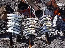 Obviously, although the traditional thing is the sardine, many other foods can be spit. Thus, it is common to spit other fish such as horse mackerel, sea bream, sea bass, etc. In these cases, the cane is inserted through the animal's mouth. It is also common to see squid or other large mollusks. The embers of the skewer can be used, of course, to roast other foods such as meat or vegetable skewers or potatoes.[2]