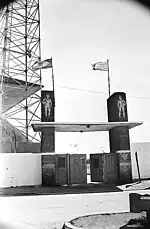 Main entrance to the stadium. The two columns with the statues engraved were preserved after the venue was demolished