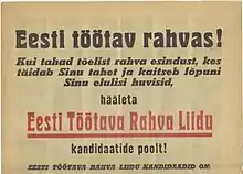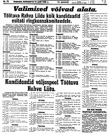 The Estonian Working People's Union (Estonian: Eesti Töötava Rahva Liit) was a front organization of the Communist Party of Estonia (de facto controlled by the Stalinist Soviet regime and the Communist Party of the Soviet Union) formed to contest in the rigged 1940 Estonian parliamentary election, as the sole officially allowed bloc. It consisted of 22 organizations, including the formally independent Estonian Communist Party, Estonian branch of Komsomol, the Central Union of Estonian Trade Unions, and cultural society "Idea". Its platform claimed to unite "democratic strata of the society" and demanded friendship and alliance between Estonia and the USSR, democratic liberties, raising salaries, combatting unemployment, social security, land for the landless, assistance for small farms, lowering the workers' burden of debt, re-organization of personal taxation, free education, ethnic equality, democratization of the military and wide development of the national culture. According to official results, 92.8% of voters voted for the bloc, with a voter turnout of 84%.