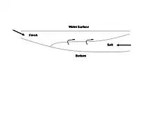 Inverse estuaries occur in dry climates where evaporation greatly exceeds the inflow of freshwater. A salinity maximum zone is formed, and both riverine and oceanic water flow close to the surface towards this zone.[7] This water is pushed downward and spreads along the bottom in both the seaward and landward direction. The maximum salinity can reach extremely high values and the residence time can be several months. In these systems, the salinity maximum zone acts like a plug, inhibiting the mixing of estuarine and oceanic waters so that freshwater does not reach the ocean. The high salinity water sinks seaward and exits the estuary.[8][9]