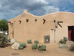 The Estufa is an elliptical, one-story building loosely modeled after a kiva at Santo Domingo Pueblo.[10] As such, it was one of the earliest expressions of the Pueblo Revival style in New Mexico, and is the oldest surviving example at UNM. The walls are adobe and are approximately 14 inches (36 cm) thick. The building was originally accessed via an external staircase and roof trapdoor, but this arrangement has since been replaced by a more conventional door. The interior of the Estufa contains a single windowless room, approximately 500 square feet (46 m2) in area,[7] which has been described as a pit with seating around the edge.[15]