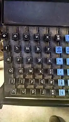 A Linotype machine keyboard. It has the following alphabet arrangement twice, once for lower case (the black keys) and once for upper case (the white keys), with the keys in the middle for numbers and symbols: etaoin / shrdlu / cmfwyp / vbgkqj / xz