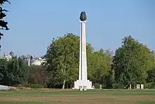 The memorial is located in the Park of Friendship, in the Blegrade's neighborhood of Ušće. Park of Friendship is part of the larger Park Ušće, in the municipality of New Belgrade. It is in the park's plane trees alley, some 300 m (980 ft) away from the central landmark in this part of Belgrade, the Ušće Towers skyscrapers.[2] The location of the present monument was formerly occupied by a statue of pharaoh Thutmose III, a gift from the government of Egypt.[3]