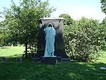 Eternal Silence has been called "eerie",[5] "somber",[5] "grim-looking",[6] "mysterious",[7] and "haunting".[7] The bronze figure, based on traditional depictions of the Grim Reaper, is set against a black granite base and stands 10 feet (3.0 m) tall upon that base.[5] The black granite provides contrast for the bronze statue, which is heavily oxidized because of its age.[5][8] The cemetery used to shine the statue to return its true bronze patina but received many complaints and requests to return it to its more dramatic green sheen; the cemetery now keeps the statue in its preferred oxidized state. The hooded figure was influenced by Taft's own "ideas on death and silence".[4] Historically speaking, the figure in Eternal Silence is related to the sculpted funeral procession around the Tomb of Philip the Bold in Dijon, France and the Adams Memorial by Augustus Saint-Gaudens in Washington, D.C.[4] The statue has been noted as Graceland Cemetery's most "unforgettable" monument.[1][5][8] The monument was designed by Taft and cast by Jules Bercham.[9][10] On its base, Taft inscribed the north side with his signature; the south side is inscribed with Am. Art Bronze Foundry J. Bercham -Chicago-.[5] The monument falls within Art Nouveau style.[4]