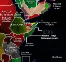 After the death of Emperor Menelik II in 1913, the uncrowned Emperor Lij Iyasu assumed power in Addis Ababa, despite facing political opposition due to his views on European influence and alternative power structures.[9] At the onset of World War I, French and British representatives sought the support of the Ethiopian crown prince as a counter against their German counterparts. Rumours circulated that Ethiopia might intentionally join the war, potentially gaining access to the Red Sea via Italian Eritrea. Because of diplomatic ties to the Central Powers since 1882, by virtue of the Triple Alliance, Ethiopia would attack Eritrea as the Italian feared.[10]