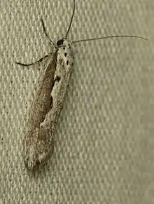 The length of the forewings is 8.4–11.7 mm (0.33–0.46 in). The ground color of the forewings is divided by longitudinal line and is dark gray on the costal half and whitish gray on the dorsal half. There are several black spots. The ground color of the hindwings is pale to dark gray. Adults are on wing from February to October.[2] There are multiple generations per year. Adults rest by day along the midrib of the a leaf of their host plant, resembling a bird dropping.[3]