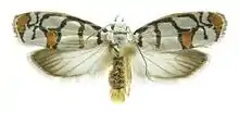 The length of the forewings is 8.3–8.6 mm (0.33–0.34 in). The ground color of the forewings is white with three distinct brownish lines and a large, square, bright ocherous patch. The apical and terminal areas have a broad, triangular, bright ocherous patch. The terminal area has an open circle composed by five brownish radiating arms. The hindwing ground color is whitish, becoming brownish near the base.