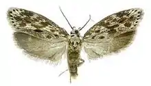 The length of the forewings is 8.1–9.1 mm (0.32–0.36 in) for males and 8.3–9.1 mm (0.33–0.36 in) for females. The ground colour of the forewings is whitish mostly covered with irregular dark brown elongated markings except by the apex. There are two distinct dark brown dots at the base of the posterior half. The terminal line is composed of eight blackish dots from before the costa to the tornus. The hindwing ground colour is brown, darker at the apex.