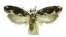 The length of the forewings is 10.3–10.5 mm (0.41–0.41 in) for males and 10.5–10.7 mm (0.41–0.42 in) for females. The costal half of the forewings is dark brown from the base to the termen, except for the apex, which is white enclosing two dots on the terminal line. The longitudinal line separates a dark costal half from the paler posterior half. There is a brown spot on the base at the premedial line. The hindwing ground color is whitish, getting dark towards the apical margin.