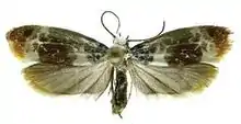 The length of the forewings is 7–8.8 mm (0.28–0.35 in). The ground color of the forewings is white, basally heavily spotted with shining gray or silver-blue on both the costal and dorsal areas. The ground color of the hindwings is whitish at the base, becoming brown towards the margins. Adults are on wing in February (in Trinidad), in May (in San Salvador and Yucatán), from June to July (in Veracruz), from July to August (in Sinoloa and Sonora), in November (in Venezuela) and in December (in Oaxaca).[1]