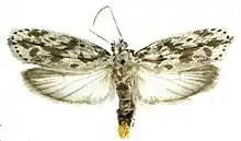 The length of the forewings is 15.9–16.4 mm (0.63–0.65 in) for males and 16.4–16.7 mm (0.65–0.66 in) for females. The ground color of the forewings is whitish, with a series of elongated dark markings. The hindwing ground colour is whitish, becoming brownish at the apex.
