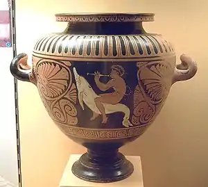 A youth mounted on a dolphin and playing the flute; stamnos, circa 360/340 BC