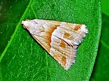 The wingspan can reach 14–18 millimetres (0.55–0.71 in)[6] Forewings are pale ochreous, tinged with yellowish, with a pale reddish median band bordered with white, preceded by brown suffusion. A brown tint is present near the apex. A black dot is visible on the discocellular. The submarginal line is pale and hardly marked and contains a black speck below the apex. The hind wings are brownish gray, whiter towards the base.[5]