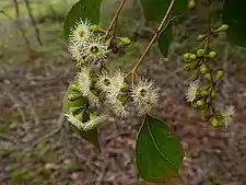 • E. baueriana Schauer subsp. baueriana is a tree to 20 metres (66 ft) with fruit 6–7 mm (0.2–0.3 in) long and 4–6 mm (0.2–0.2 in) wide;[11]