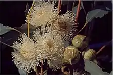Eucalyptus burracoppinensis, commonly known as Burracoppin mallee[3] is a mallee that is endemic to Western Australia. It has smooth bark, except for a short "stocking" of loose rough bark at the base, lance-shaped adult leaves, flower buds arranged in groups of three, white flowers and top-shaped fruit.