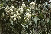 Eucalyptus carnea, known as the thick-leaved mahogany[2] or broad-leaved white mahogany,[3] is a species of tree that is endemic to coastal areas of eastern Australia. It has rough, stringy bark from the trunk to the thinnest branches, lance-shaped or curved adult leaves, flower buds in groups of between seven and eleven, white flowers and cup-shaped to hemispherical fruit.[2][3]