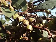 Eucalyptus cooperiana, commonly known as the many-flowered mallee,[3] is a species of mallee that is endemic to an area along the south coast of Western Australia. It is described as being "of striking appearance by reason of its smooth, white bark and acutely angled branchlets". It has lance-shaped adult leaves, flower buds in groups of between nine and thirteen or more, creamy yellow flowers and urn-shaped fruit.