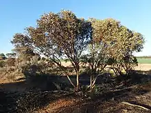 The eucalypt is associated with the western mallee subgroup which is characterised by several eucalypts, including E. oleosa, E. moderata, E. incrassata, E. foecunda, E. redunca and E. uncinata. The understorey is predominantly shrubby with species of Melaleuca and Acacia along with the occasional Triodia.[13]