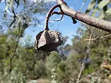 The mallee typically grows to a height of 1.5 to 8 metres (5 to 26 ft) that has rough fibrous bark on the trunk with smooth bark above. It produces white-cream to red-pink flowers between April and October.[1] The flower buds and fruits are large and ribbed or “winged” and are found in pendulous groups of three.[2] It has variable form ranging from a small compact shrub-like habit to a taller more irregular habit. The flowers are highly decorative usually with pink-red buds that open to cream-yellow flowers that are around 3 centimetres (1.2 in) across.[3] The dull, grey-green, thick and concolorous adult leaves have a disjunct arrangement. The leaf blade has a narrow lanceolate to broad lanceolate and is basally tapered. The buds are globose and rostrate, with a calyx calyptrate that sheds early. The fruits are hemispherical with a raised disc and exserted valves.[4][5]
