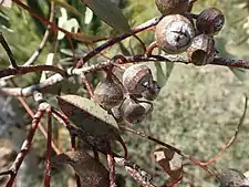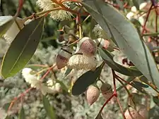 Prior to flowering, this eucalypt forms ornamental globose buds.[5] The branches of the main stem are twisting and spreading and the lignotuber is large, allowing regeneration after fire. New branches may emerge from the bole without response to fire, and these intertwine with the older trunk to produce a tangled and irregular appearance as mature trees.[6]