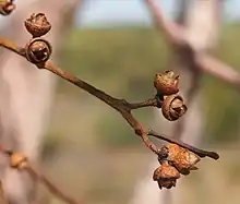 The flower buds are arranged in leaf axils in groups of seven, sometimes up to eleven, on an unbranched peduncle 6–12 mm (0.24–0.47 in) long, the individual buds on pedicels 1–3 mm (0.039–0.118 in) long. Mature buds are oval, 3–7 mm (0.12–0.28 in) long and 3–5 mm (0.12–0.20 in) wide with a rounded, blunt conical or shortly beaked operculum. Flowering occurs between March and August and the flowers are creamy white. The fruit is a woody cup-shaped, barrel-shaped or hemispherical capsule 5–8 mm (0.20–0.31 in) long and 4–6 mm (0.16–0.24 in) wide with the valves enclosed below the rim or prominently protruding, depending on subspecies. The seeds are yellow-brown and round or elliptical.[2][4][6][7][8]