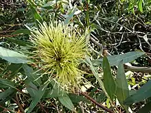 It produces large yellow-green flowers that occur from July to October in the species' native range.[3] Each simple, axillary conflorescence is made up of three to seven flowered umbellasters on broadly flattened peduncles.[4] The fruits or capsules are clustered and sessile on a flattened peduncle. They have a campanulate shape with one prominent rib with many weak ribs. The capsules are 1.8 to 4 centimetres (0.7 to 1.6 in) in length and 2.2 to 2.5 cm (0.9 to 1.0 in) wide with three exserted valves.[5]