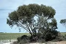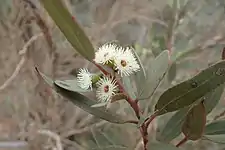 Eucalyptus micranthera, commonly known as the Alexander River mallee[2] or milkshake mallee,[3] is a species of mallee that is endemic to a small area along the south coast of Western Australia. It has smooth bark, lance-shaped adult leaves, flower buds in groups of seven or nine, creamy white flowers and more or less hemispherical fruit.